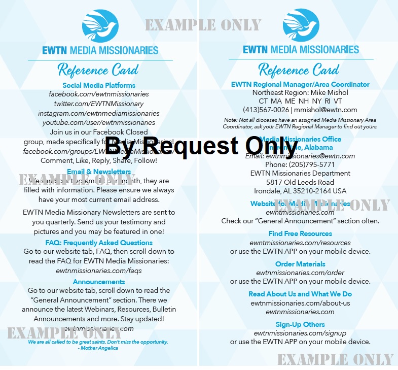 Order your Media Missionary Reference Card & keep it handy, so the next time you want to contact EWTN or use a link for your Media Missionary work... its at your fingertips! Card is 6 1/2 x 3 1/2 in. & customized with your Regional Manager! (limit of 2 per Missionary)